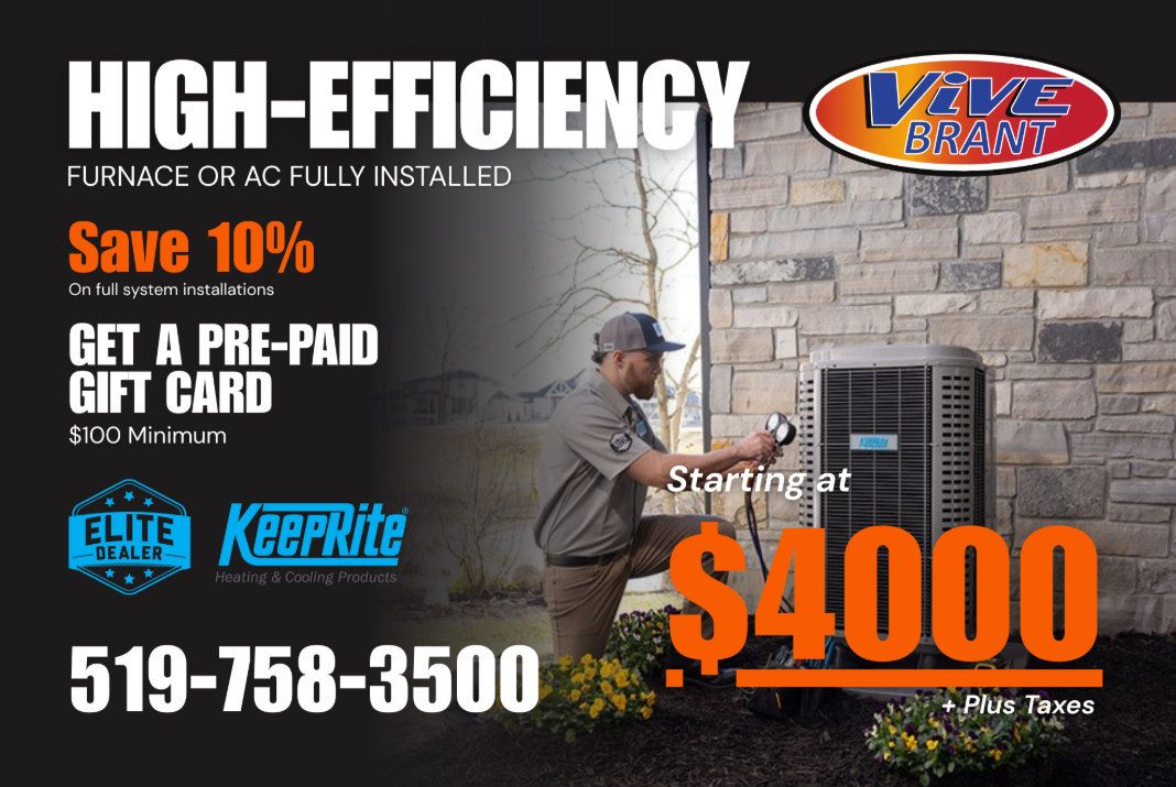 This limited-time offer includes high-efficiency furnaces or air-conditioning systems starting at just $4,000 fully installed, making it easier than ever for homeowners to upgrade older equipment before peak usage seasons. Vive Brant’s experienced installers ensure all systems are properly sized and installed for long-lasting performance.